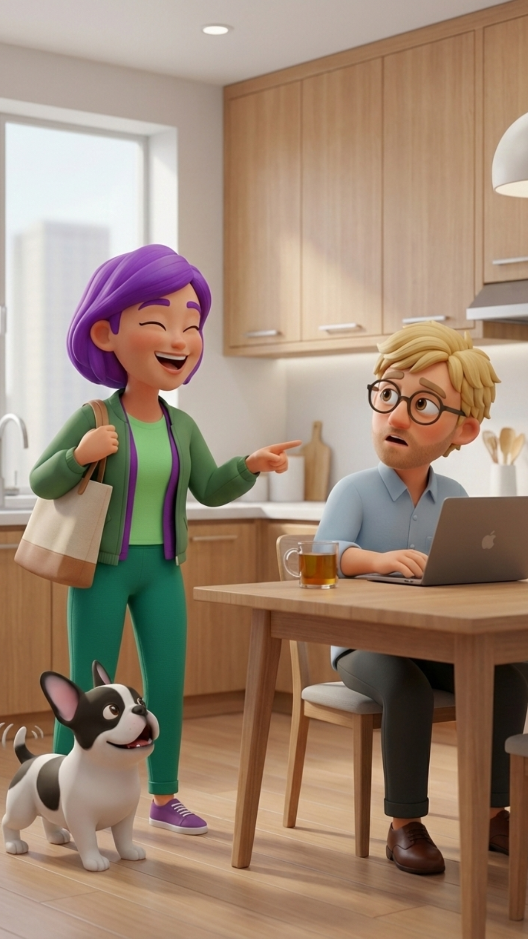 “Zo te zien is hier iemand wat minder enthousiast,” zegt Nova terwijl ze haar tas neerzet en Peter diep zucht.